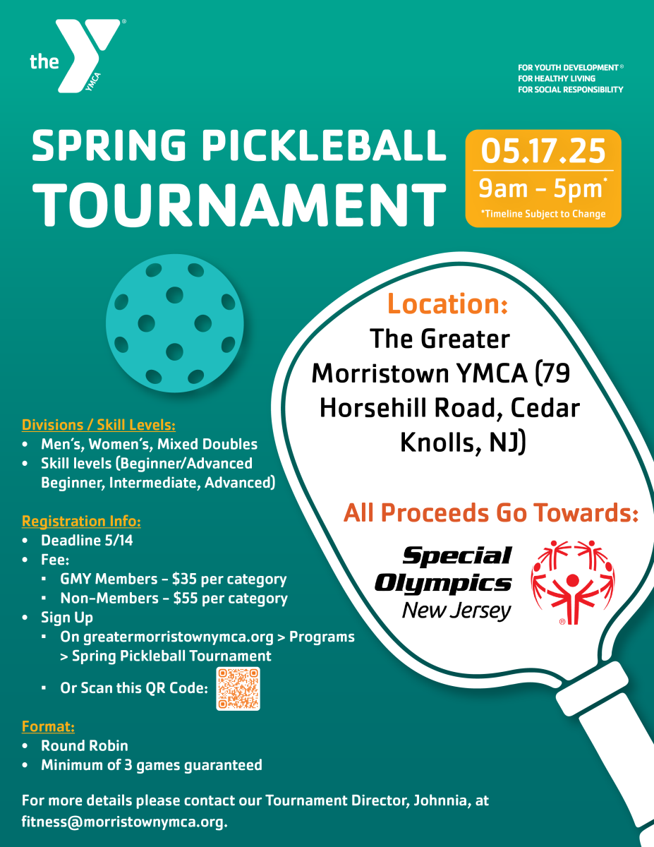 For any questions or concerns regarding this tournament, please contact Johnnia, our Pickleball Director at fitness@morristownymca.org.